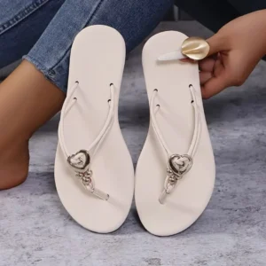 La singularité de ces tongs se trouve dans l’anneau en forme de cœur, un détail minimaliste qui ne manquera pas de captiver l’attention.